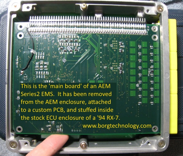The AEM EMS can be found on winning autocross, drag, drift, road-race and time-attack cars across the US and around the world. People have designed kits to install the EMS on other vehicles such as BMW, Lotus, and Porsche. Since AEM does not offer a Series2 EMS for the FD RX-7, we have engineered our own plug-and-play kit using a custom circuit board that fits an AEM Series2 EMS inside the OEM Mazda ECU enclosure.